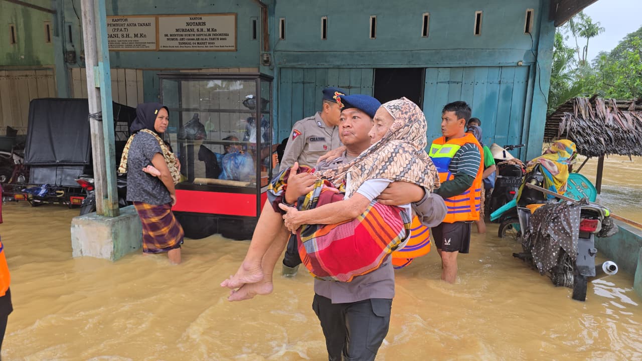 Brimob Polda Aceh Evakuasi Warga di Tengah Banjir Besar yang Melanda Sejumlah Kabupaten
