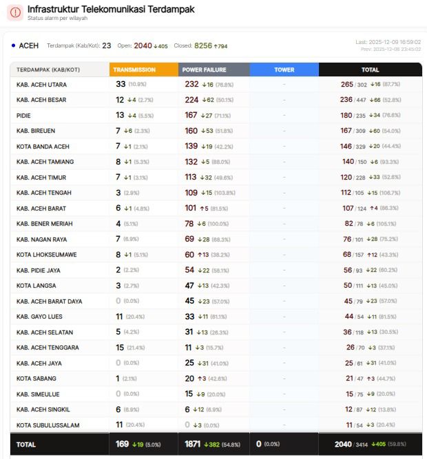 Berdasarkan data infrastruktur telekomunikasi yang dihimpun pada Selasa, 9 Desember 2025 pukul 16.59 WIB, sebanyak 1.871 titik mengalami power failure. Perangkat di titik tersebut tidak dapat beroperasi sama sekali akibat tidak menerima pasokan listrik. Secara keseluruhan, terdapat 2.040 infrastruktur telekomunikasi yang tercatat terdampak di seluruh Aceh.