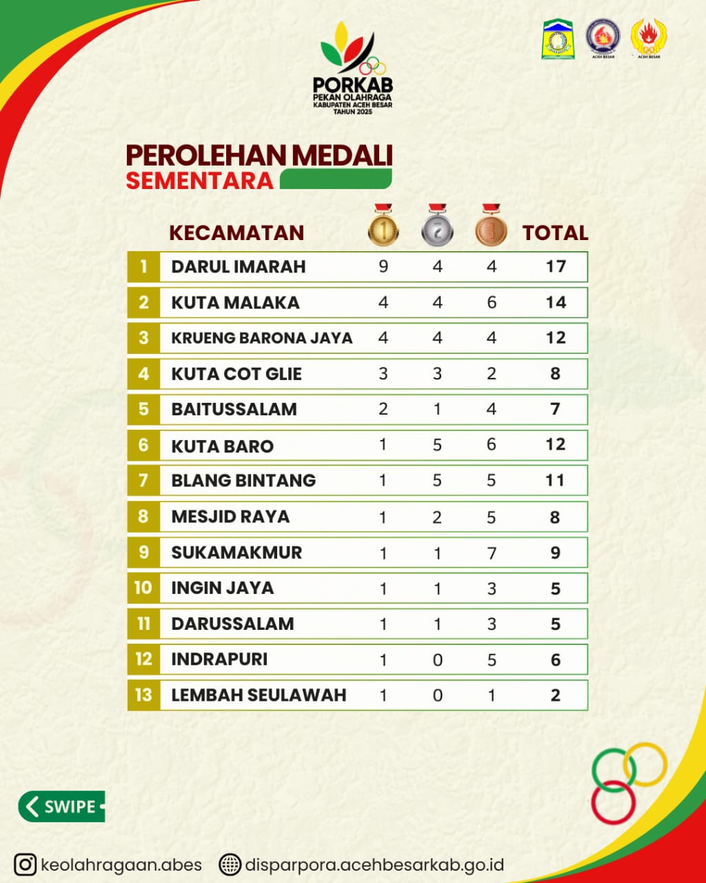 Lingkanews.com | Aceh Besar — Kontingen Darul Imarah terus memimpin klasemen sementara Pekan Olahraga Kabupaten (Porkab) Aceh Besar 2025. Hingga hari ketiga, kontingen ini sudah meraih 17 medali dengan rincian 9 emas, 4 perak, dan 4 perunggu.